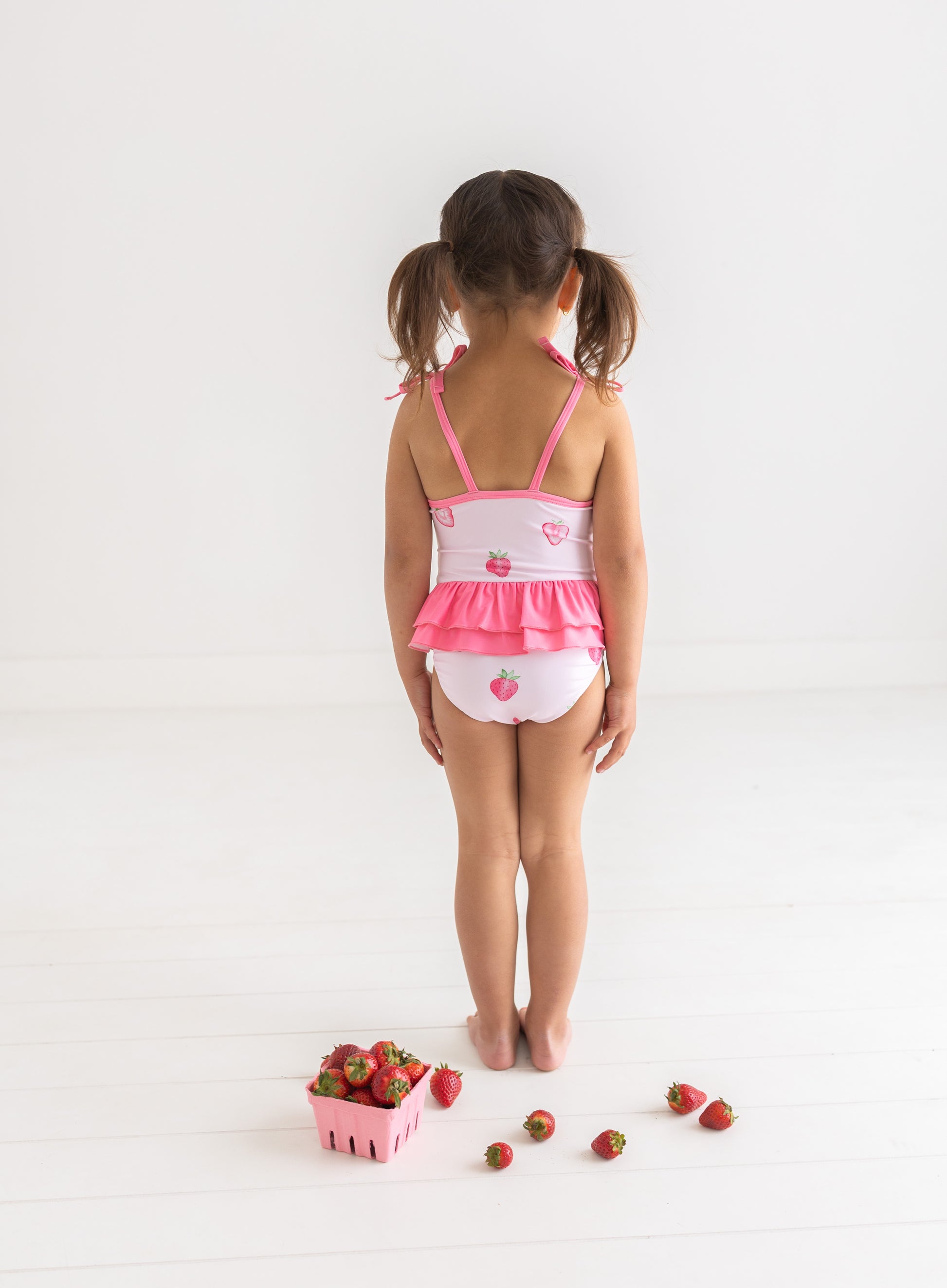 Make a splash with our adorable strawberry-print one-piece, designed with both style and comfort in mind for your little one. Featuring charming functional tie straps for a customizable fit and cheerful berry vibes all around, this suit is perfect for sunny playdays by the water.