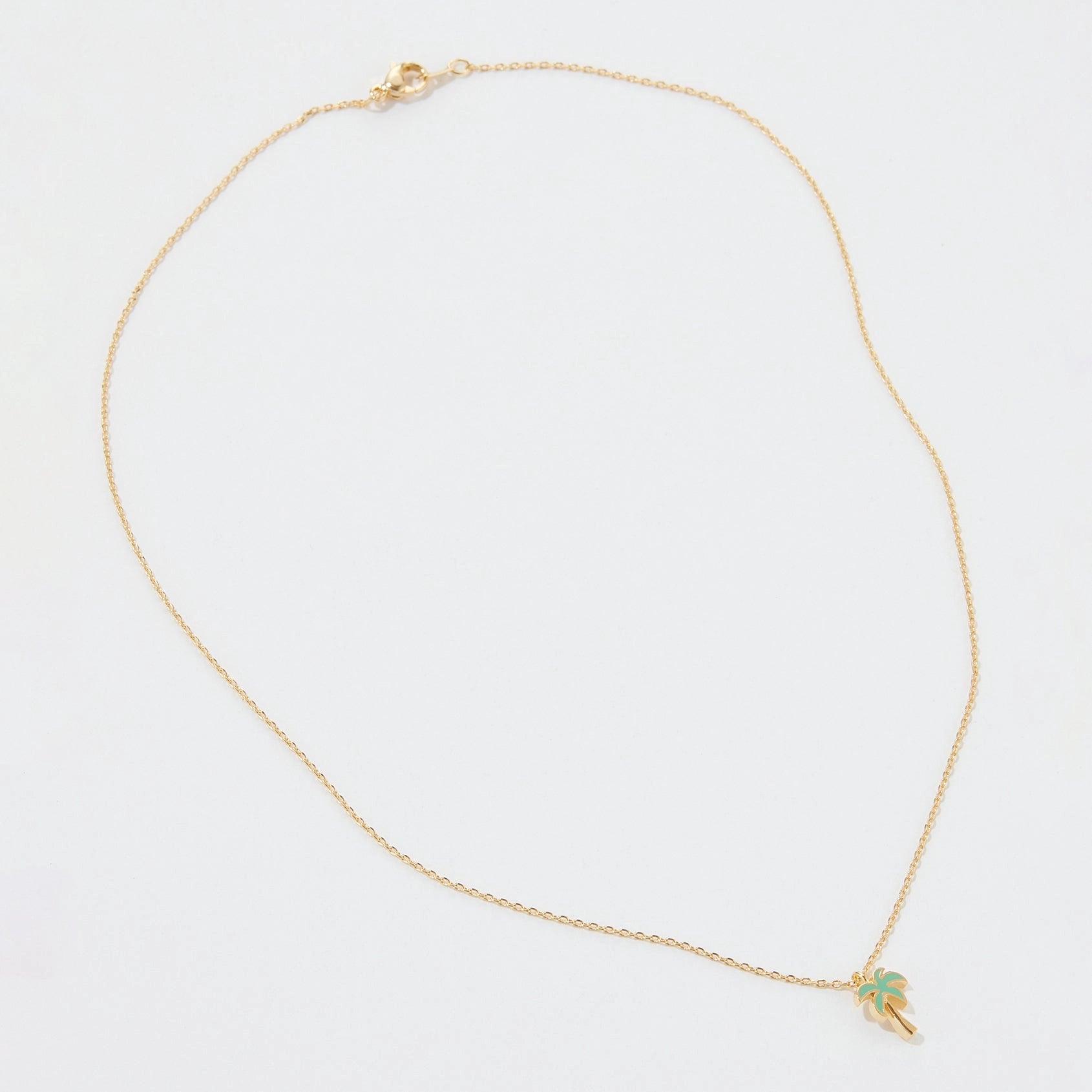 Bring vacation vibes to your everyday look with this gold palm tree pendant necklace. Featuring a tiny palm charm with a touch of green enamel, this playful piece captures tropical charm in a minimalist design. Perfect for beach lovers or those who dream of sun-soaked days. Lightweight and easy to layer, this necklace is a fun accent for casual outfits and a great gift for summer or travel lovers.